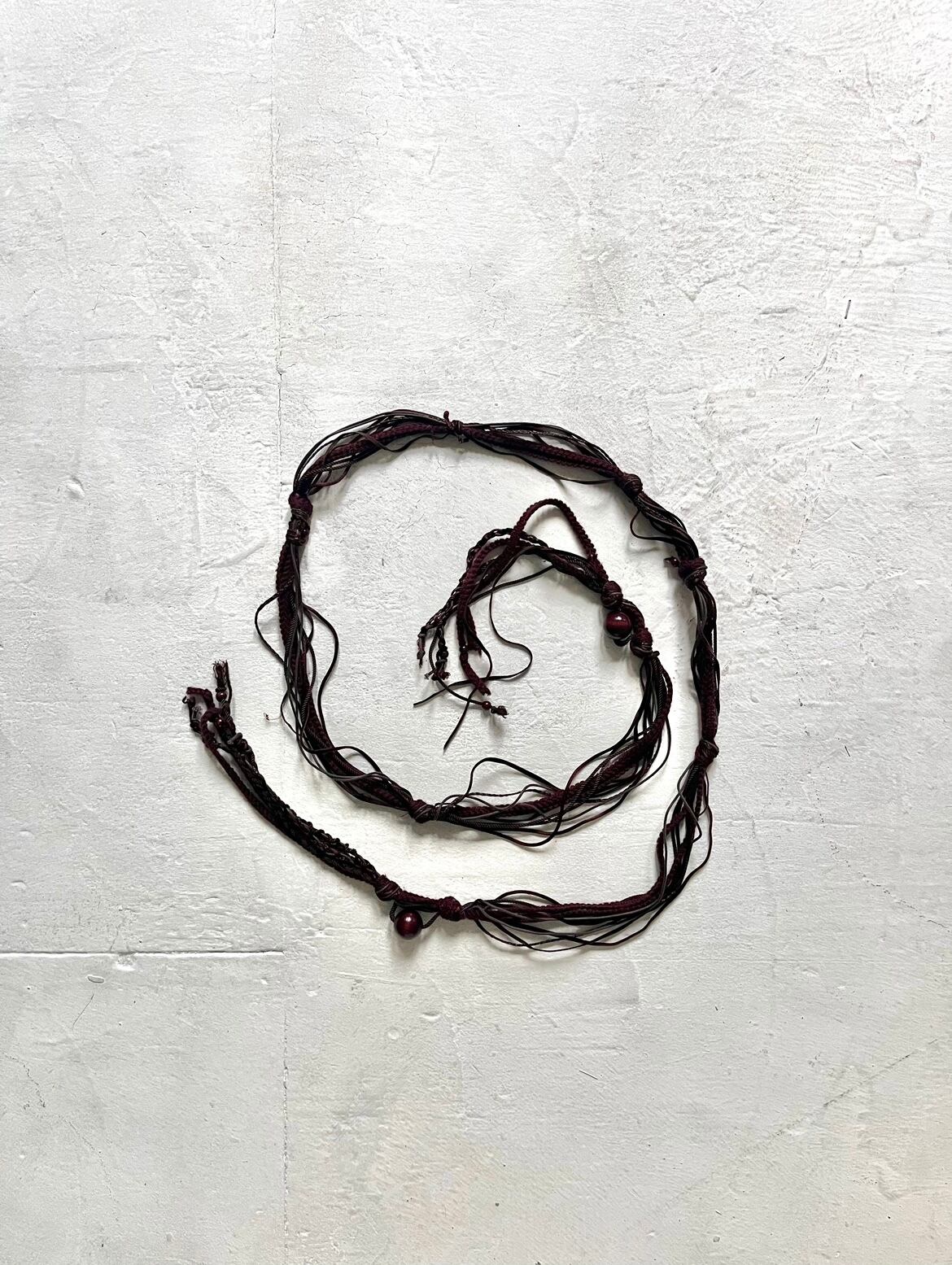 -Constructed from multiple braided cords, the design features intricate hand-like weaving with hanging strands and subtle bead details. The deep burgundy tone combined with the raw, artisanal texture reflects the distinctive aesthetic of early 2000s Number (N)ine, where grunge, military, and ethnic influences were blended.